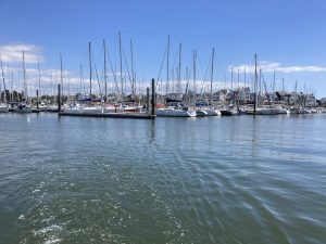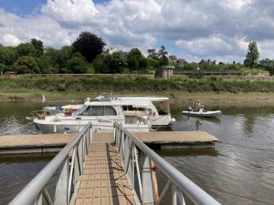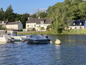 Arrivée à Hennebont le ponton est court, après une hésitation je vire trop court et le courant nous porte sur un petit bateau portant le nom de Paradis. Notre bateau croché sa bouée arrière. Impossible de se dégager avec ce courant sans risquer des dégâts, il faut attendre la renverse. A l’étale Megawatt se libère et nous nous amarrer au ponton qui est ne comporte que 4 places et sert à la fois au chantier et au port.