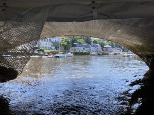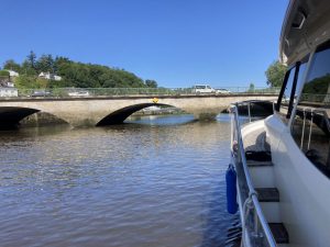 Le lendemain il faut passer sous les ponts d’Hennebont. il y a un créneau horaire assez étroit car à marée haute il n’y a pas assez de place sous le pont et à marée basse pas assez d’eau. Un panneau indique en permanence la hauteur d’eau.